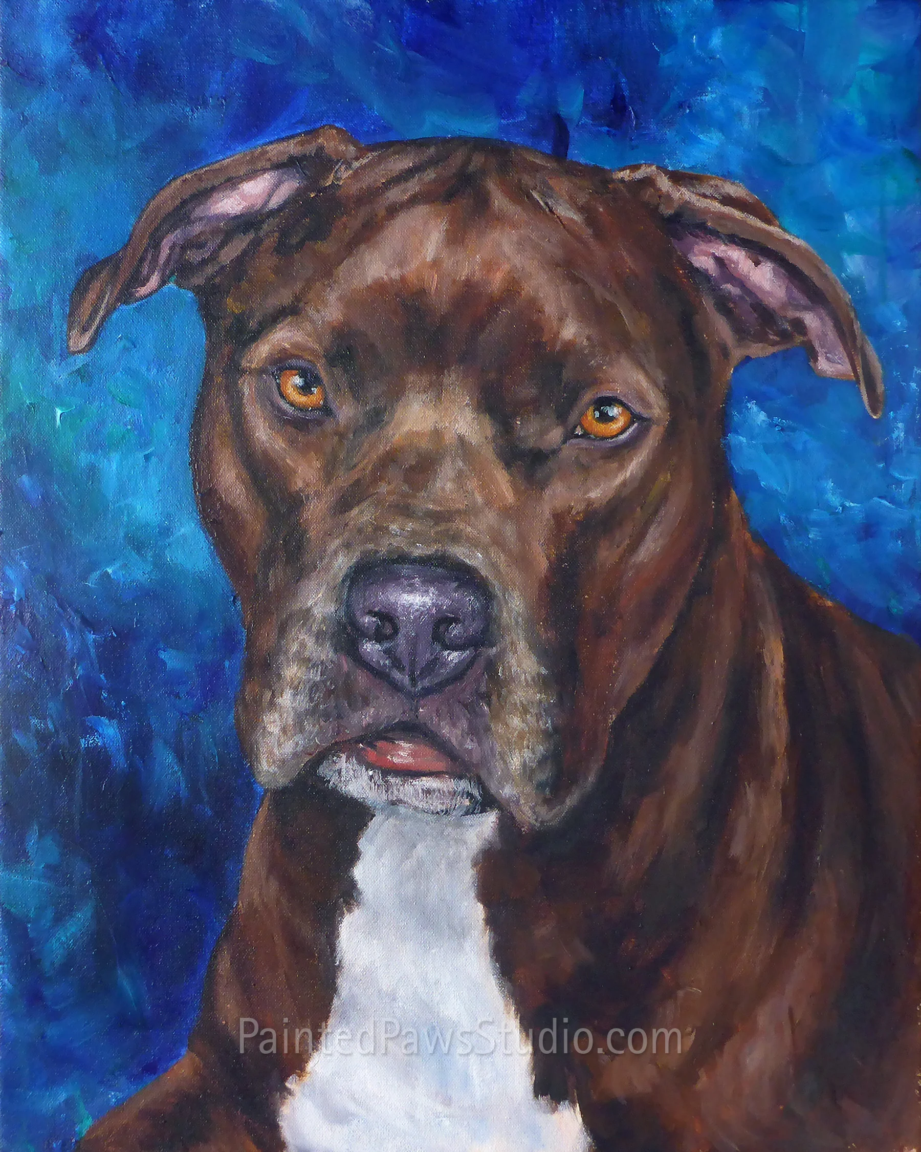 Includes the headshot of your pet and your choice color background (standard) on stretched canvas with a gallery profile.